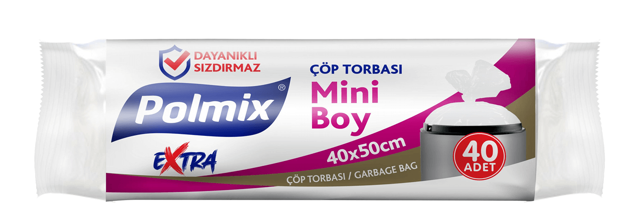 Polmix Mini Boy Çöp Torbası, kompakt boyutları ve dayanıklı yapısıyla ev, ofis, banyo ve mutfak kullanımları için idealdir. 40×50 cm ölçüsüyle küçük çöp kovalarına tam uyum sağlar. 12 mikron kalınlık ve 70 gram ağırlık yapısı sayesinde yırtılmadan, sızdırmadan güvenli kullanım sunar.